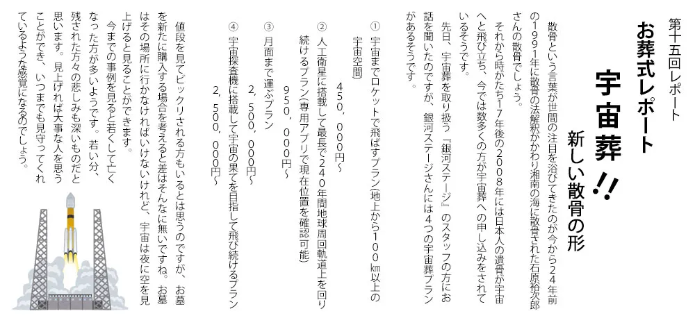 それから時がたち17年後の2008年には日本人の遺骨が宇宙へと飛び立ち、今では数多くの方が宇宙葬への申し込みをされているそうです。