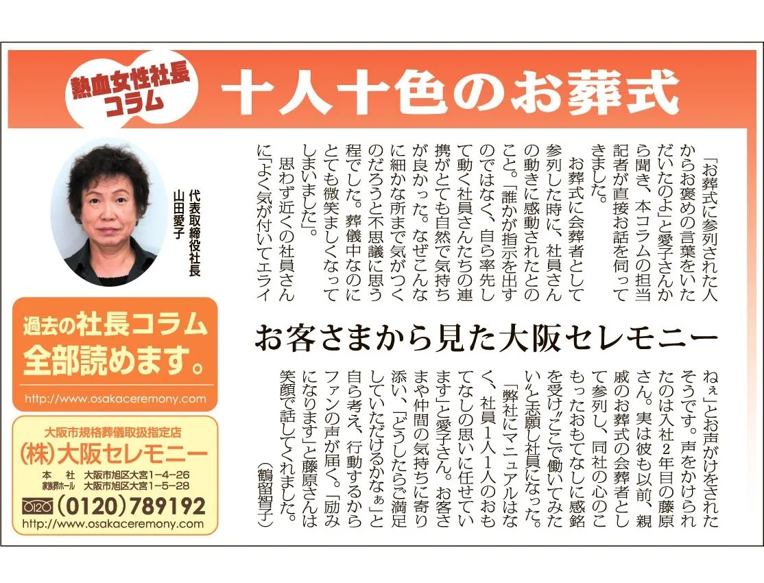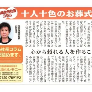 お葬式に会葬者として参列した時に、社員さんの動きに感動されたとのこと。「誰かが指示を出すでもなく、自ら率先して動いている社員さんたちの連携がとても自然で気持ちが良かった。なぜこんなに細かな所まで気がつくのだろうと不思議に思う程でした。葬儀中なのにとても微笑ましくて笑顔になってしまいました」思わず近くの社員さんに『よく働いていてエライねぇ』とお声がけをされたそうです。声をかけられたのは20代後半の藤原さん。実は彼も以前、親戚のお葬式の会葬者として参列。心のこもったおもてなしに感銘を受け“ここで働いてみたい”と志願し社員になった。「弊社は指導もマニュアルもなく、社員1人1人のおもてなしの思いに任せています」と愛子さん。お客さまや仲間の気持ちに寄り添い自ら行動される社員さんたちのファンの声。「励みになります」と藤原さんは笑顔で話してくれました。