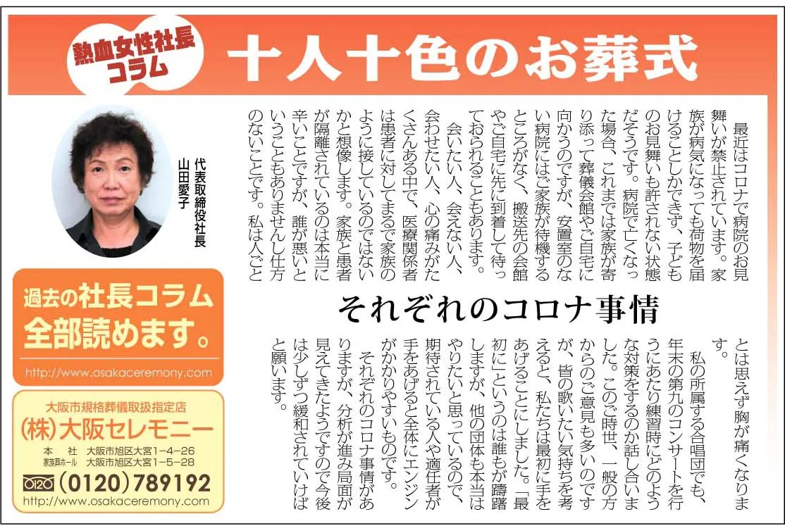 最近はコロナで病院のお見舞いが禁止されています。家族が病気になっても荷物を届けることしかできず、子どものお見舞いも許されない状態だそうです。病院で亡くなった場合、これまでは家族が寄り添って葬儀会館やご自宅に向かうのですが、安置室のない病院にはご家族が待機するところがなく、搬送先の会館やご自宅に先に到着して待っておられることもあります。