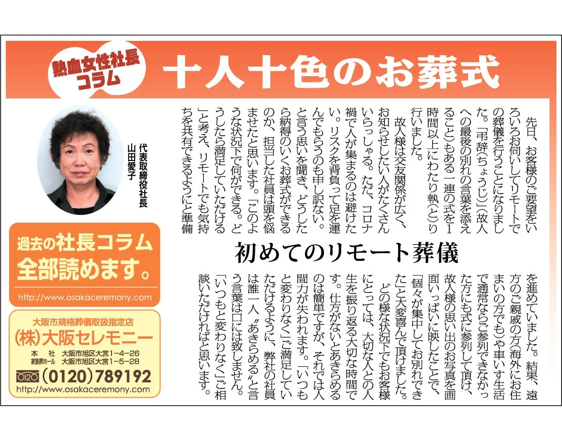 先日、お客様のご要望を色々お伺いしてリモートでの葬儀を行うことになりました。「弔辞(ちょうじ)」(故人への最後の別れの言葉を添えること)もある一連の式を1時間以上にわたり執(と)り行いました。