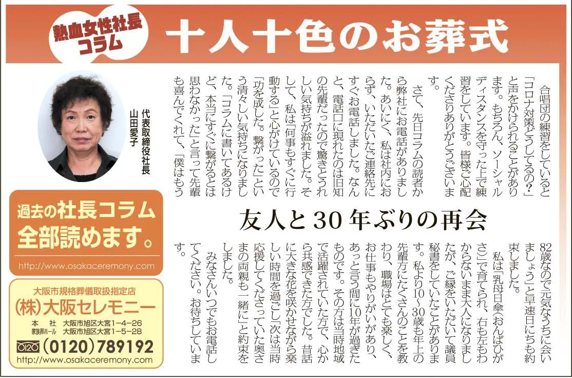 さて、先日コラムの読者から弊社にお電話がありました。あいにく、私は社内におらず、いただいたご連絡先にすぐお電話しました。なんと、電話口に現れたのは旧知の友人だったので驚きとうれしい気持ちが溢れました。そして、私は「何事もすぐに行動する」と心がけているので「功を成した、繋がった」という清々しい気持ちになりました。「コラムに書いてあるけど、本当にすぐに繋がるとは思わなかった」と言って先輩も喜んでくれ、「僕はもう82歳なので元気なうちに会いましょう」と早速日にちも約束しました。