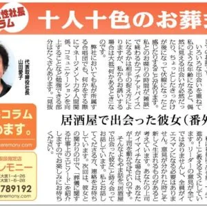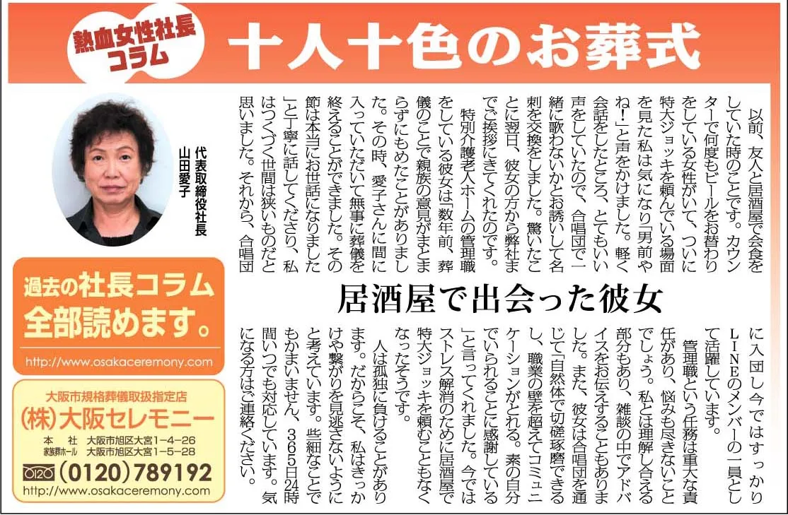 以前、友人と居酒屋で会食をしていた時のことです。カウンターでビールを飲んでいる女性が何度もお替わりをして、ついに特大ジョッキを頼んでいる場面を見た私は気になり「男前やね!」と声をかけました。軽く会話をしたところ、とてもいい声をしていたので、合唱団で一緒に歌わないかとお誘いして名刺を交換をしました。驚いたことに、翌日、彼女の方から弊社までご挨拶にきてくれたのです。