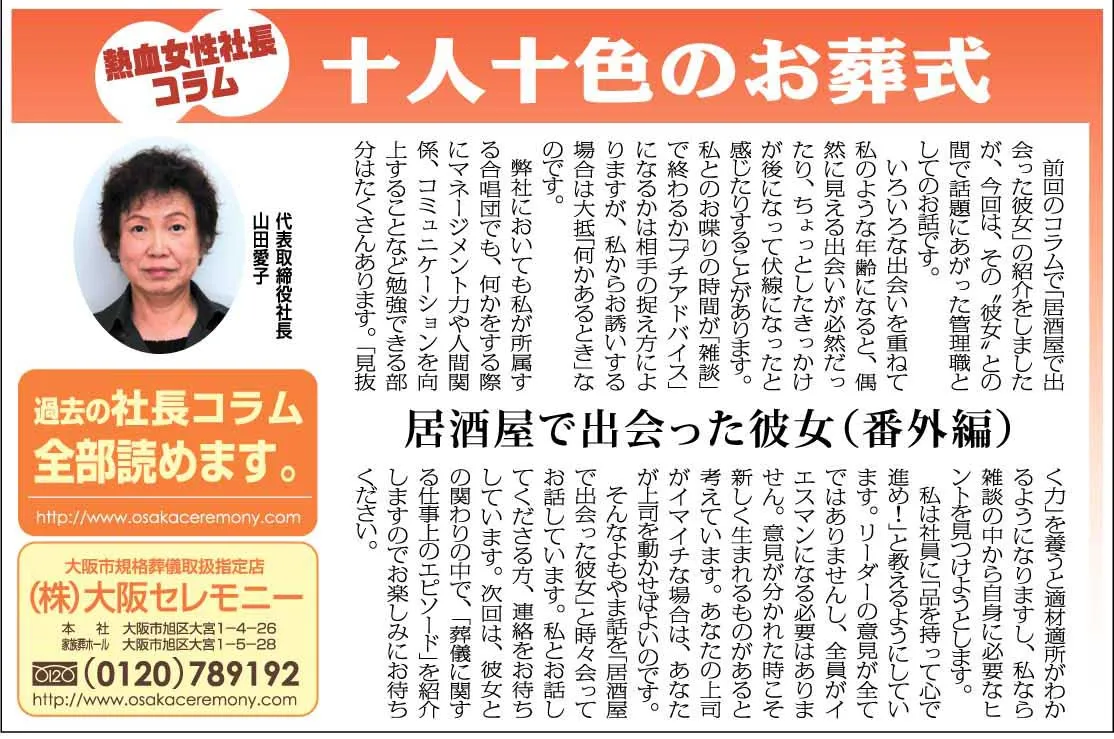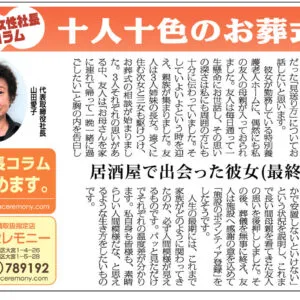そんなよもやま話を「居酒屋で出会った彼女」と時々会ってお話しています。私とお話してくださる方、連絡をお待ちしています。次回は、彼女との関わりの中で、「葬儀に関する仕事上のエピソード」を紹介しますのでお楽しみにお待ちください。