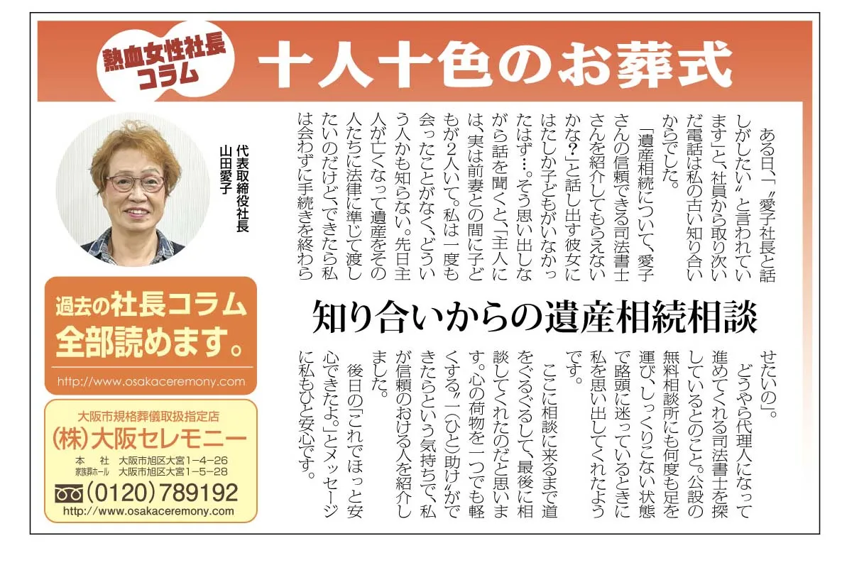 「愛子社長と話しがしたい。と言われています」と、社員から取り次いだ電話は私の古い知り合いからでした。「遺産相続について、愛子さんの信頼できる司法書士さんを紹介してもらえないかな?」と話し出す彼女にはたしか子どもがいなかったはず・・。そう思い出しながら話を聞くと、「主人には、前妻との間に実は子どもが2人いて。私は一度も会ったことがなくどういう人かも知らない。先日主人が亡くなって遺産をその人たちに法律に準じて渡したいのだけど、できたら私は会わずに手続きを終わらせたいの」。どうやら代理人になって進めてくれる司法書士を探しているとのこと。公設の無料相談所にも何度も足を運び、しっくりこない状態で露頭に迷っているときに私を思い出してくれたようです。ここに相談するまで道をぐるぐるして最後に相談してくれたと思っています。心の荷物を一つでも軽くする“一(ひと)助け”ができたらという気持ちで、私が信頼のおける人を紹介しました。後日の「これでほっと安心できたよ。」とメッセージに私もひと安心です。