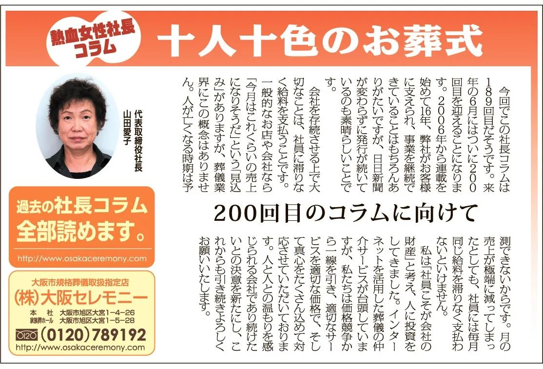 今回でこの社長コラムは189回目だそうです。来年の6月にはついに200回目を迎えることになります。2006年から連載を始めて16年、弊社がお客様に支えられ、事業を継続できていることはもちろんありがたいですが、日日新聞が変わらずに発行が続いているのも素晴らしいことです。