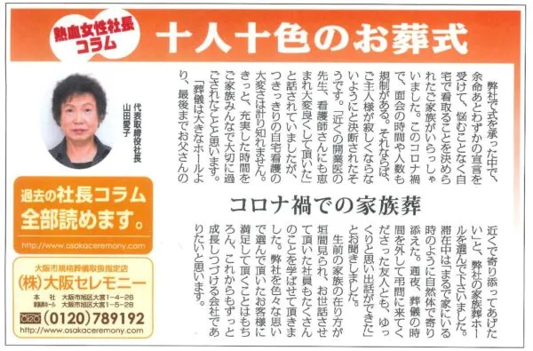 政府が公表している新しい生活様式で「冠婚葬祭は多人数は避けて」と明記されています。大手の葬儀会館では、100人以上の規模で執り行っていた葬儀が家族葬もしくは直葬に切り替わっていっているという話も聞きました。これからはますます「家族葬」が選ばれる時代になると思います。