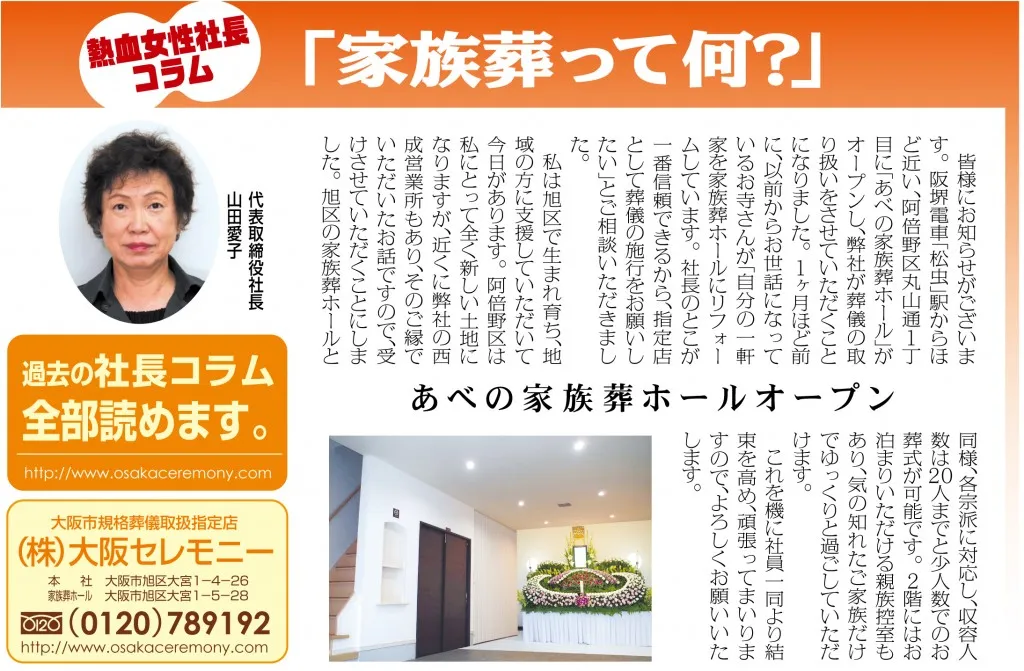 皆様にお知らせがございます。阪堺電車「松虫」駅からほど近い、阿倍野区丸山通1丁目に「あべの家族葬ホール」がオープンし、弊社が葬儀の取り扱いをさせていただくことになりました。