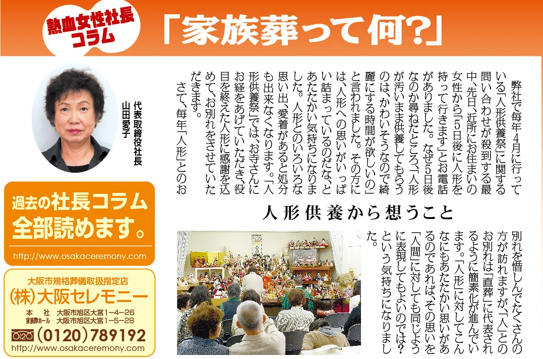 さて、毎年「人形」とのお別れを惜しんでたくさんの方が訪れますが、「人」とのお別れは「直葬」に代表されるように簡素化が進んでいます。
