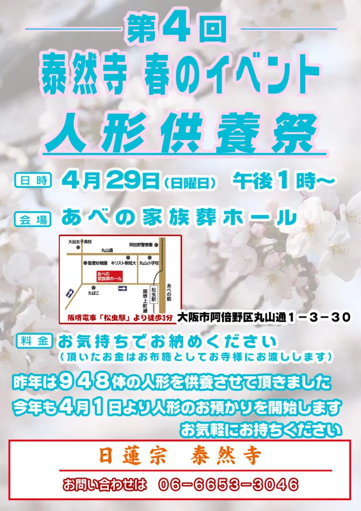 大阪セレモニー家族葬ホールでは毎年4月に「大阪セレモニー春のイベント」と題して、人形供養祭を行っております。