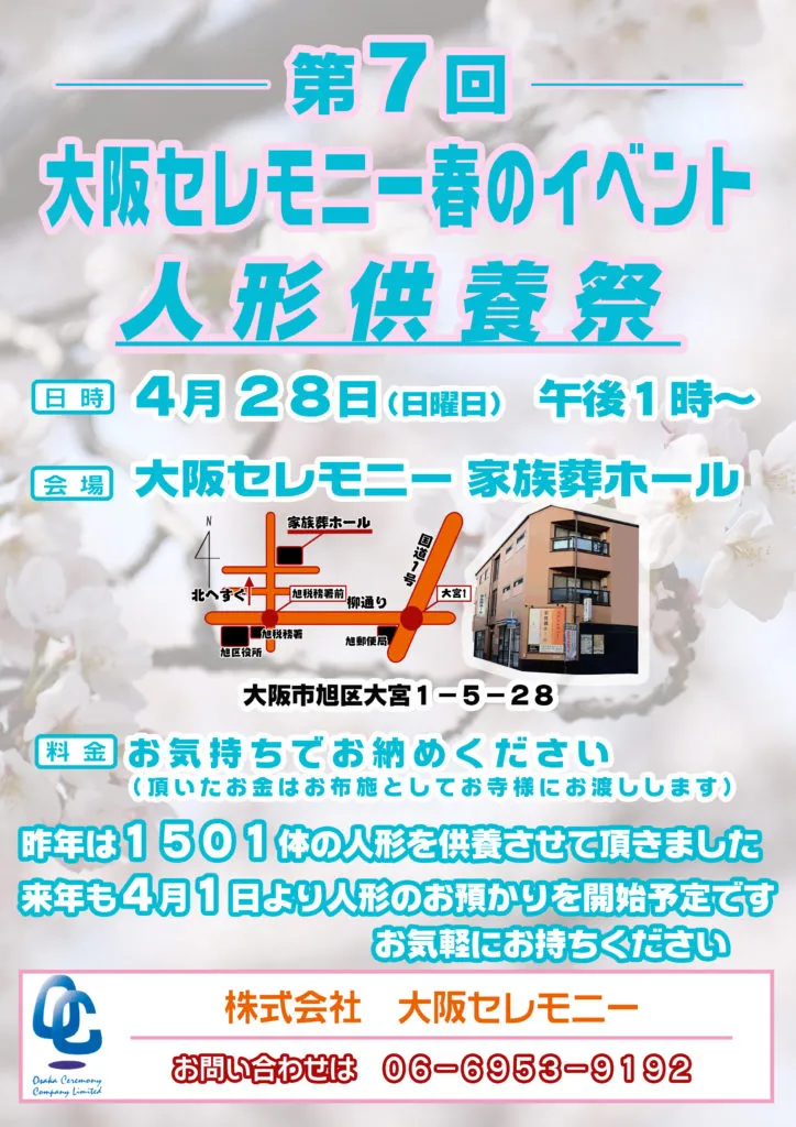 大阪セレモニー家族葬ホールでは毎年4月に「大阪セレモニー春のイベント」と題して、人形供養祭を行っております。