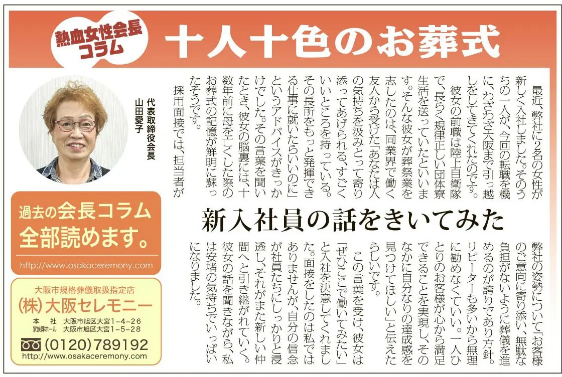 最近、弊社に2名の女性が新しく入社しました。そのうちの一人が、今回の転職を機に、わざわざ大阪まで引越しをしてきてくれたのです。彼女の前職は陸上自衛隊で、長らく規律正しい団体寮生活を送っていたといいます。そんな彼女が葬祭業を志したのは、同業界で働く友人から受けた「あなたは人の気持ちを汲みとって寄り添ってあげられる、すごくいいところを持っている。その長所をもっと発揮できる仕事に就いたらいいのに」というアドバイスがきっかけでした。その言葉を聞いたとき、彼女の脳裏には、十数年前に母を亡くした際のお葬式の記憶が鮮明に蘇ったそうです。