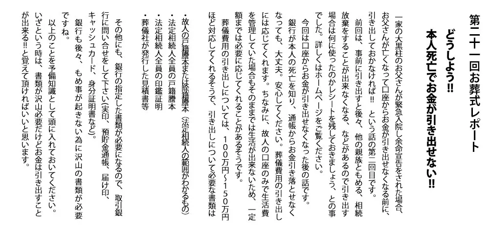一家の大黒柱のお父さんが緊急入院し余命宣告をされた場合、お父さんが亡くなって口座からお金が引き出せなくなる前に、引き出しておかなければ、という話の第二回目です。