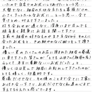 【お客様の声】M様 2013年04月19日 お客様の声 前略ごめんくださいませ。 先日はお世話になりました。 ありがとうございました。 馴れない土地で不安でしたが、 一ツ一ツ親身になって説明していただき、 又、手続きなどしていただきまして助かりました。 こうしてご親切にしていただいていますのに お礼の一言も言わずタクシーに乗り帰ったこと後悔しています。 どうぞお許しください。 職員の皆様には感謝しています。 本当にありがとうございました