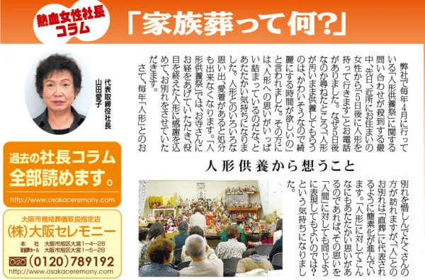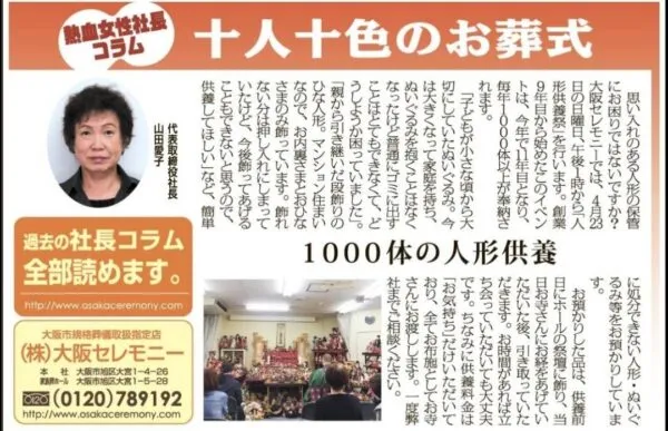 去る4月28日に弊社家族葬ホールで初めて 「人形供養祭」のイベントを行いました。 日日新聞とチラシの…